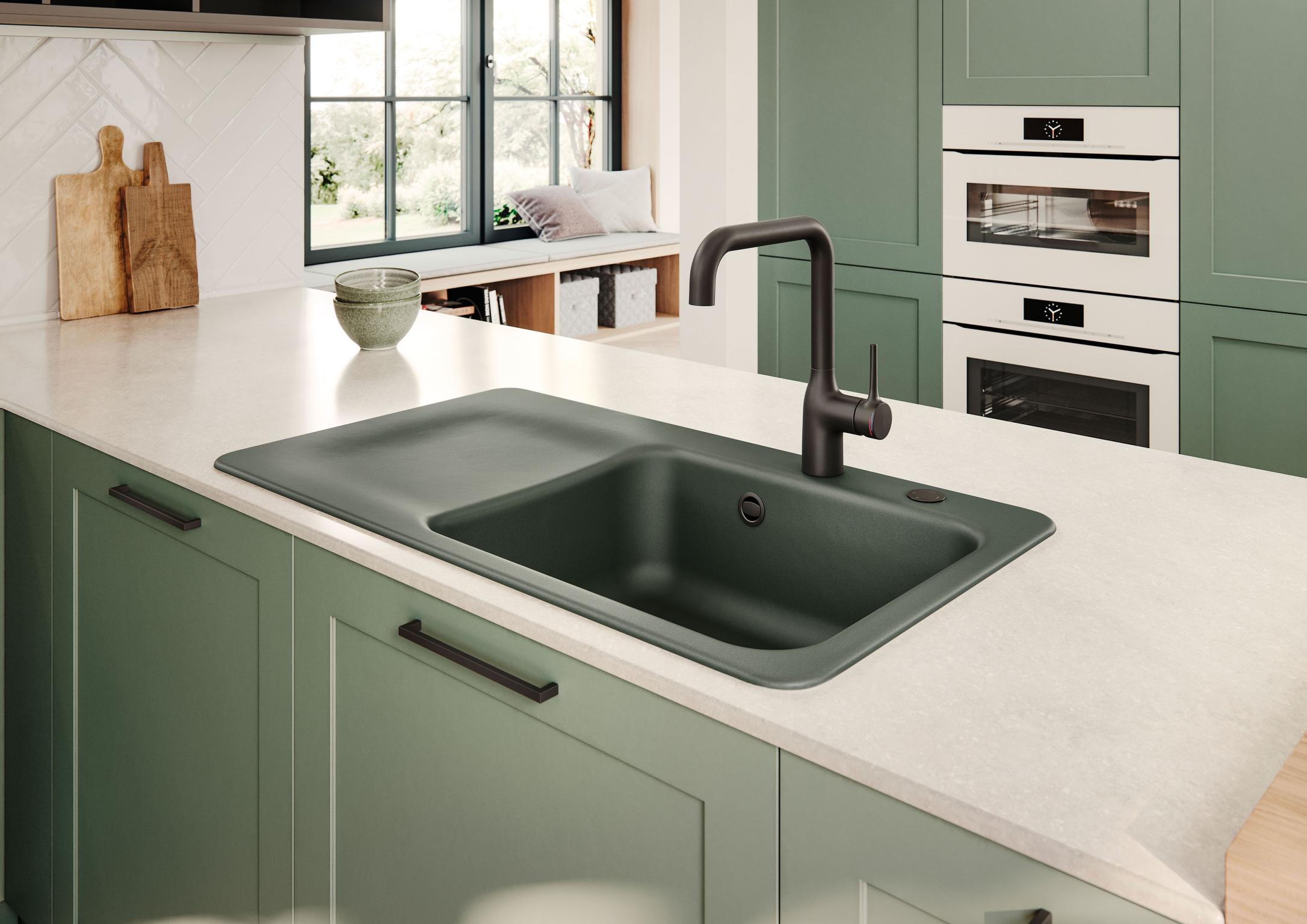 Erhältlich sind die Modelle für den 60 und 50 cm breiten Spülenschrank, als Einbauspüle und in der flächenbündigen Variante. Zur Wahl stehen aktuell 15 Keramikfarben aus glänzenden und matten Glasuren von reinem Weiß bis Tiefschwarz. Jüngster Neuzugang ist die Glasur „Eibe“, ein mattes Dunkelgrün, das sich als Kombinationspartner für Holz- und Naturtöne empfiehlt und sehr gut mit mattschwarzen und metallischen Optiken harmoniert. Weitere natürliche Farbtöne sind auch „Jasmin“, „Fango“, „Schiefer“ oder „Lava“.
